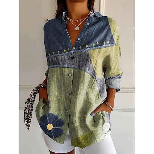 Per donna Camicia Grafico Geometrico Vintage Quotidiano Casual Manica Lunga Colletto a Camicia Top Regolari Quotidiano Ferie Stampato Verde salvia Giallo Marrone Cachi Estate Primavera