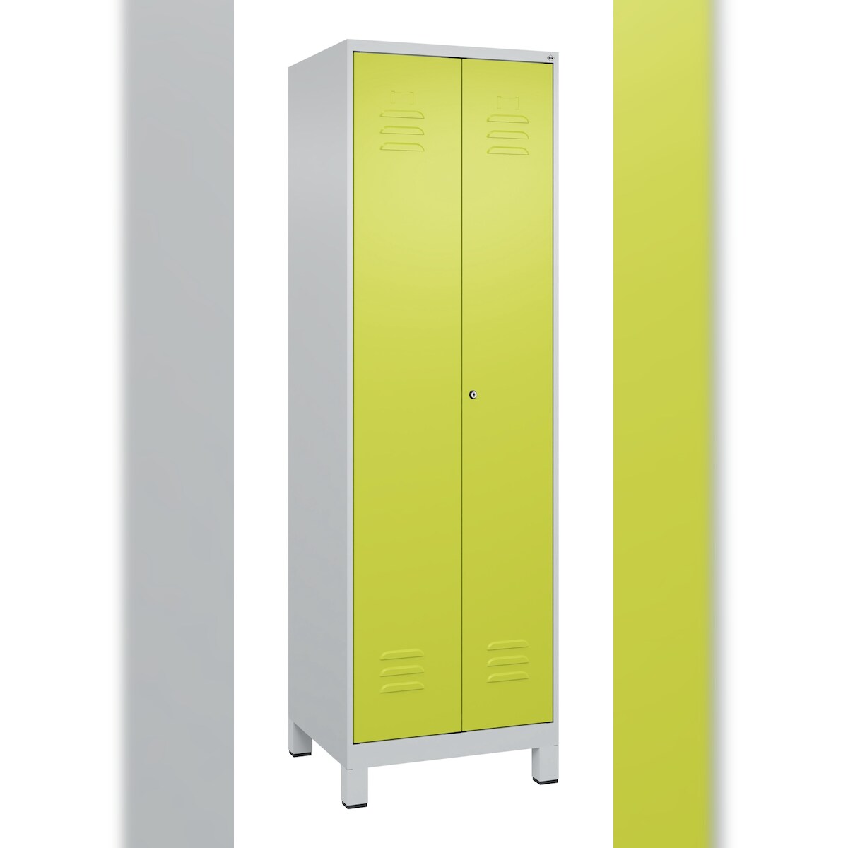 C+P Aufbewahrungs Doppel-Spind Classic PLUS, Füßen, 2 Abteile, 5 Fachböden, HxBxT 195x60x50cm, Zylinderschloss, Hellgrau/Clowngrün von PROREGAL