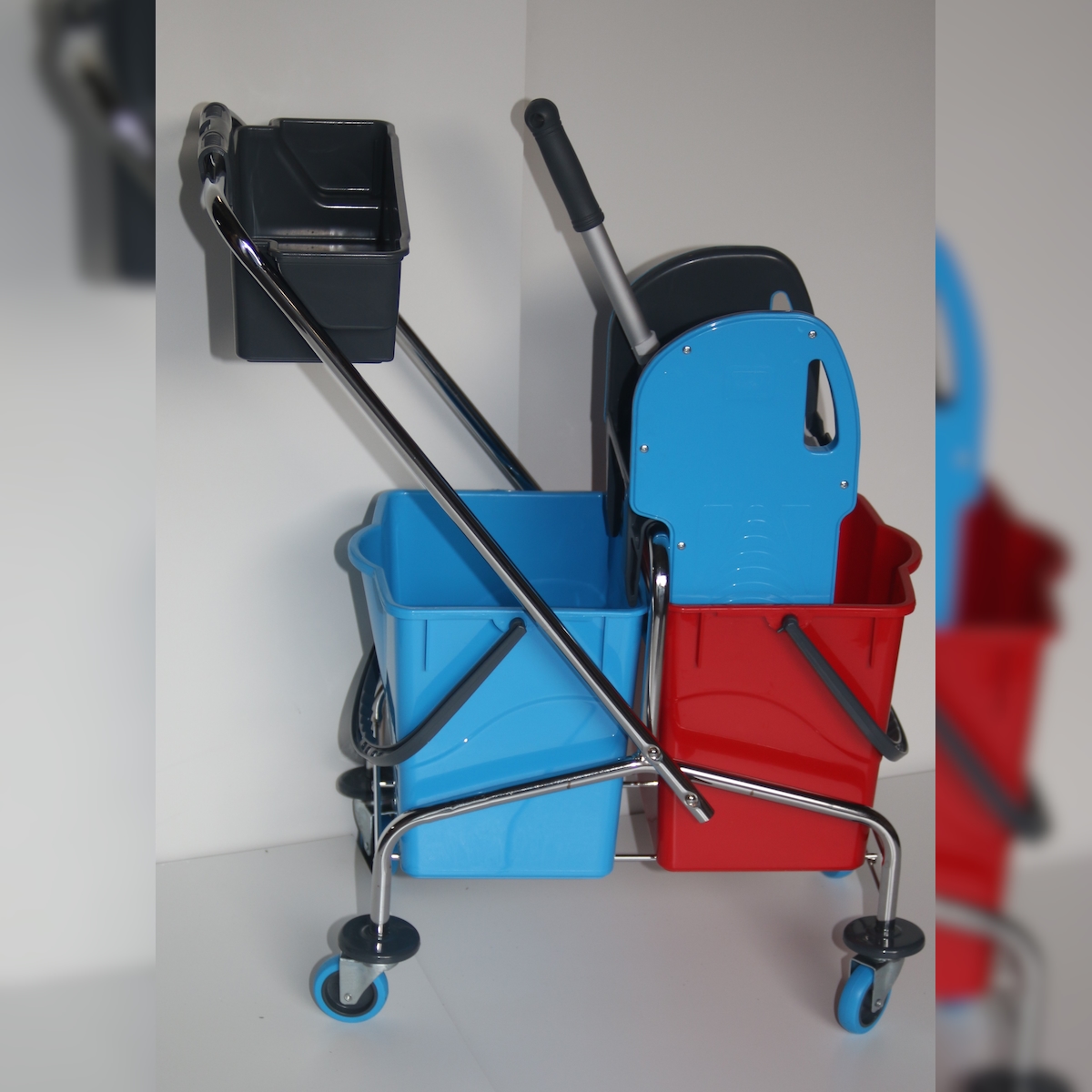 CleanSV® Reingungswagen chrom, Ablage, Reinigungswagen 2 x 18 Liter Eimer, Presse, Deichsel plus Ablagekorb