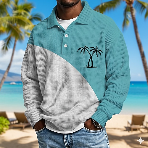 Per uomo Palma Magliette Polo a Nido d'Ape Manica Lunga Magliette polo Bavero Hawaiano Athleisure Abbigliamento quotidiano Abbigliamento da vacanza Stampa 3D Primavera Autunno Inverno Blu Giallo Viola