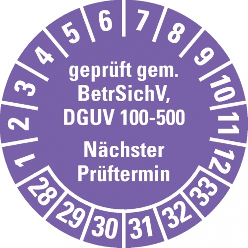 Dreifke® Prüfplakette gep.gem.BetrSichV, DGUV 100-500, NP, 28-33, violett, Dokufolie, Ø30mm, 18 Stk.