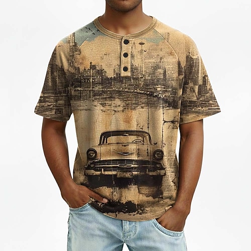 Per uomo Grafico Auto Vintage Maglia Henley Maglietta Manica Corta Moda Designer Casual Quotidiano All'aperto Primavera Primavera Autunno Tutte le stagioni Marrone Viola Verde Grigio Henley