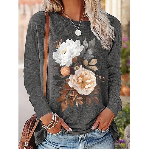Per donna Maglietta Floreale Grafico Piante Moda Elegante Classico Manica Lunga Girocollo Top Regolari Quotidiano Weekend Stampato Grigio Estate Primavera Autunno