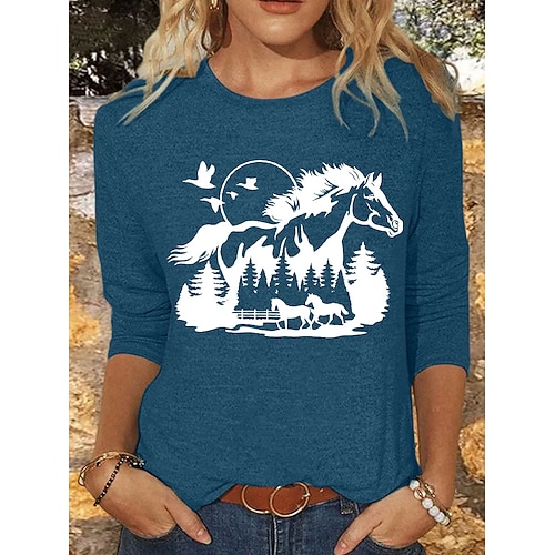 Per donna Maglietta Grafico Animale Cavallo Vintage Elegante Classico Manica Lunga Girocollo Top Regolari Quotidiano Stampato Blu Rosa Cachi Grigio Primavera Autunno Inverno