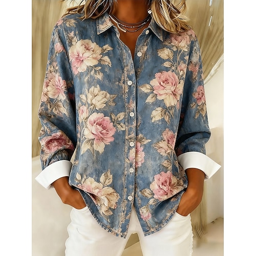 Per donna Blusa Floreale Elegante Casual Manica Lunga Colletto a Camicia Top Regolari Quotidiano Bottoni Stampato Bianco Primavera Autunno