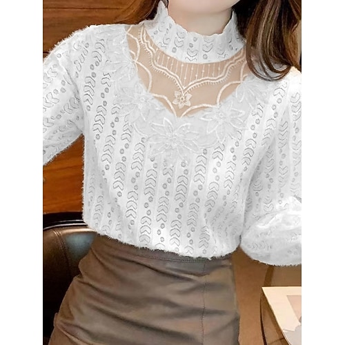 Per donna Blusa Tinta unica Elegante Essenziale Casual Manica Lunga Collo Alto Top Regolari Quotidiano Pizzo Patchwork Bianco Albicocca Primavera Autunno Inverno