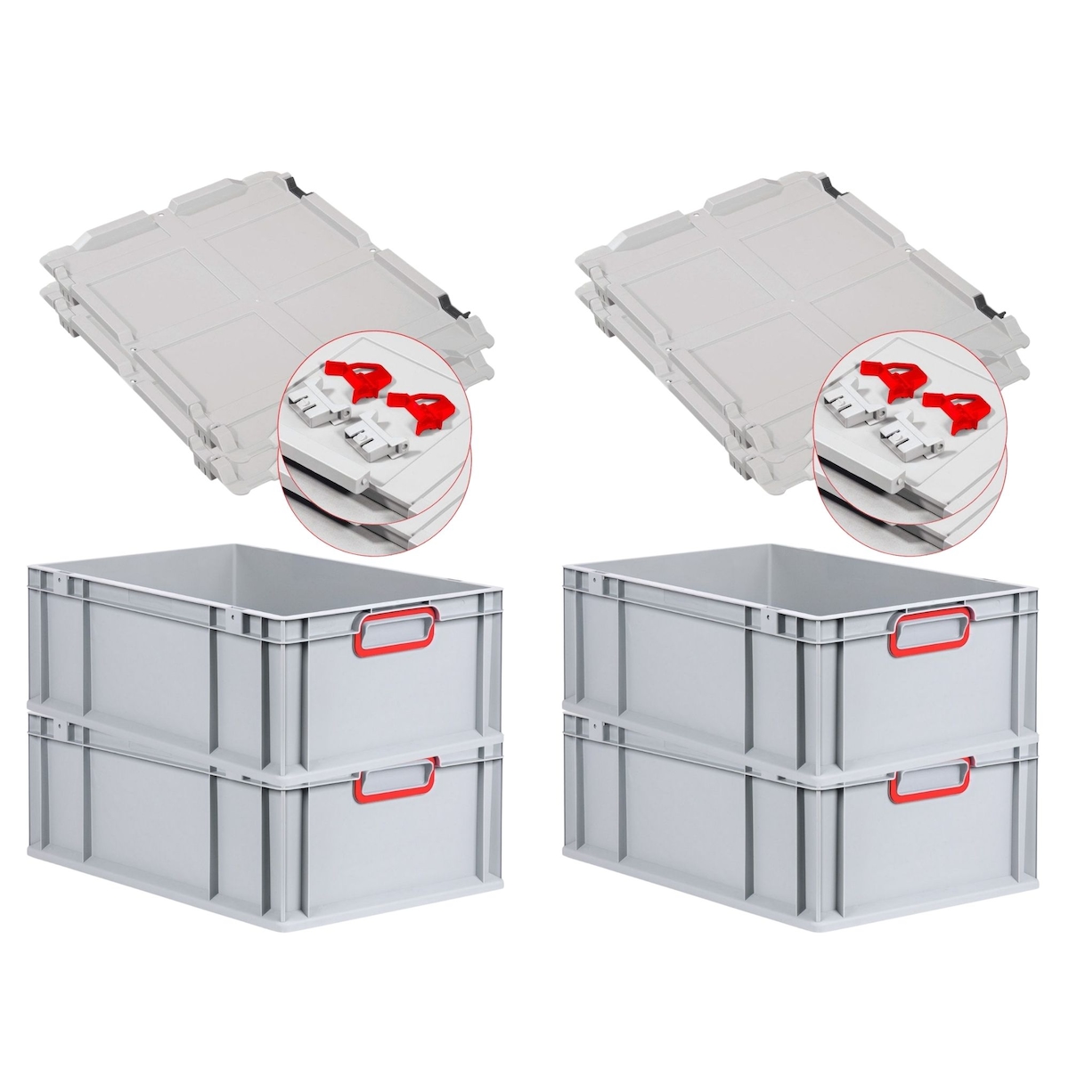 PROREGAL 4x Eurobox NextGen Color mit Scharnierdeckel & Verschlüssen | HxBxT 22x40x60cm | 44 Liter | Griffe rot geschlossen | Verstärkter Boden