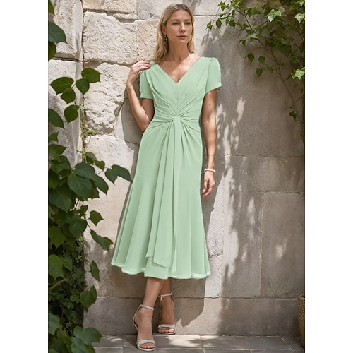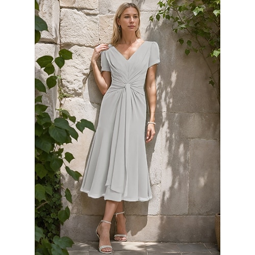 Abito A-Line madre della sposa Formal Ospite di matrimonio Abito elegante semplice minimalista scollo a V lunghezza tè in chiffon maniche corte con pieghe e arricciature