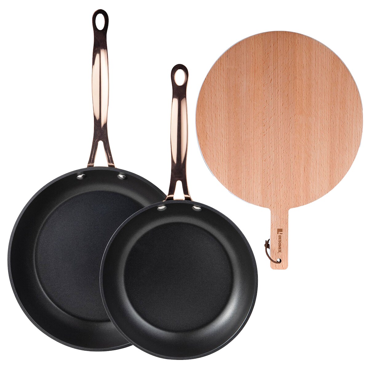 BERGNER - Set aus 2 Pfannen Ø20/24 cm aus geschmiedetem Aluminium Schwarz Matt mit Rundes Schneidebrett aus Buchenholz