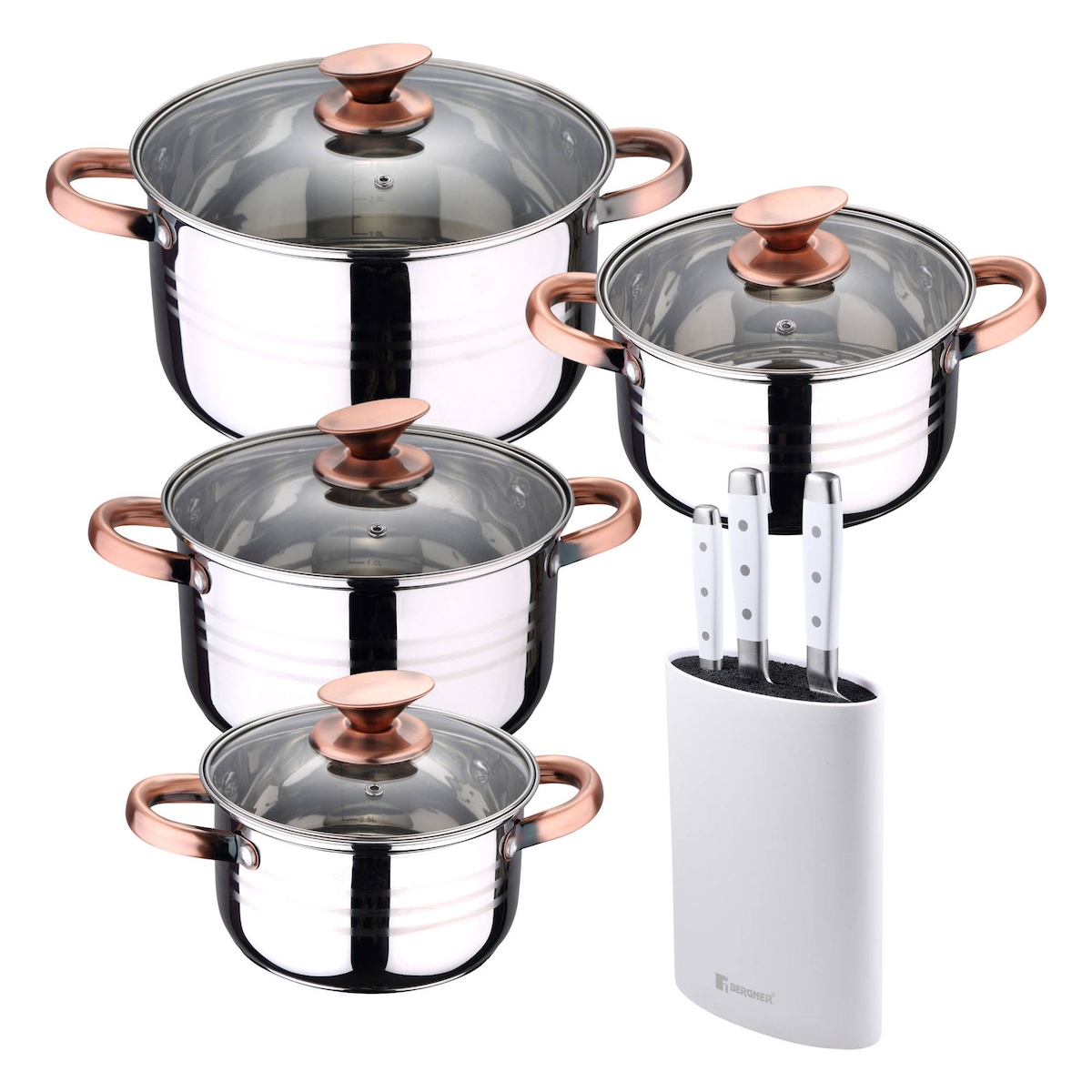 BERGNER - Kochgeschirr NONA 8-teilig 16/18/20/24 cm aus Edelstahl, induktionsgeeignet, mit 3 Edelstahlmessern