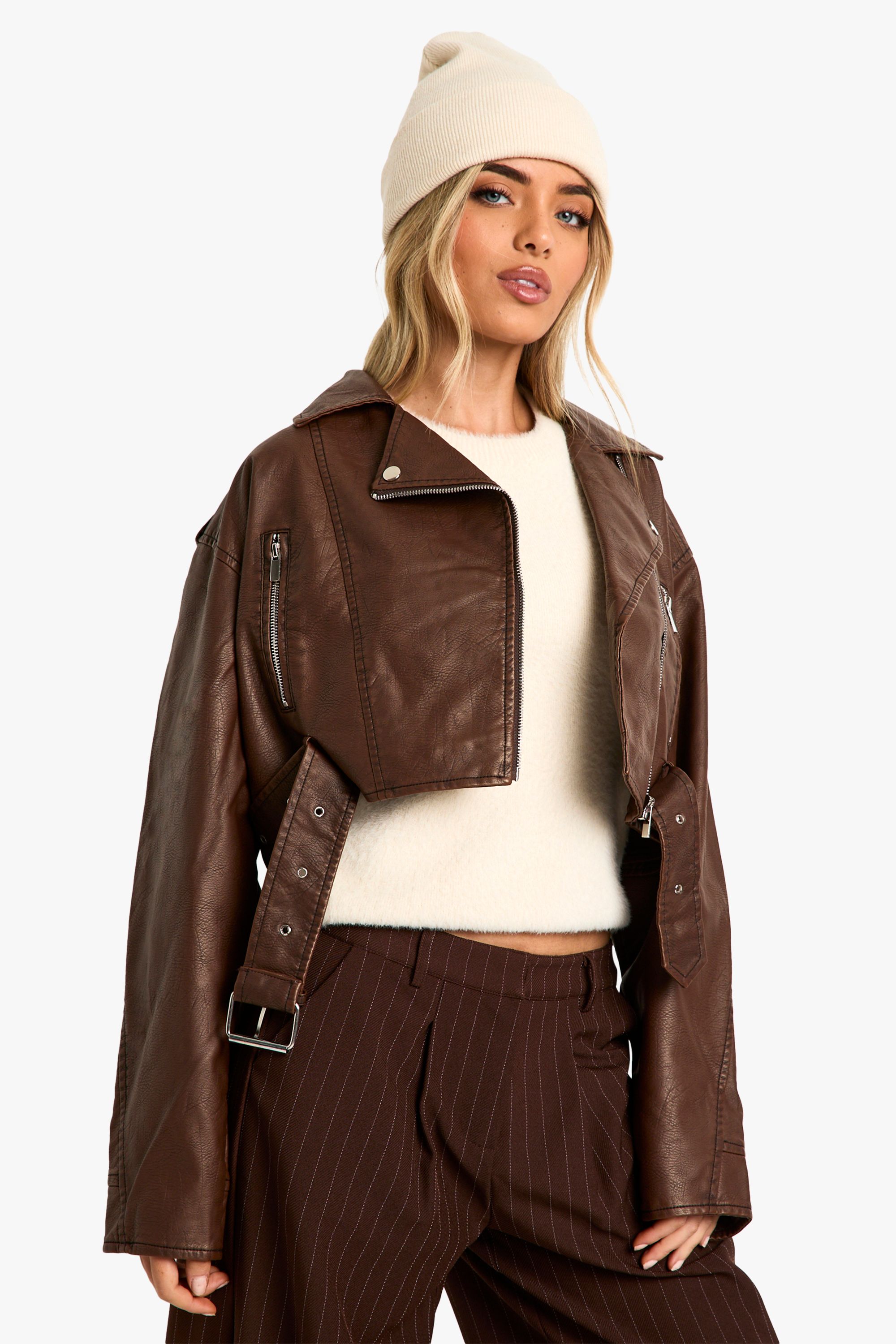 Boohoo Womens Vintage Look Faux Leather Crop Biker Jacket - Brown - Size 14 UK | Boohoo Sale | Discount Designer Brands