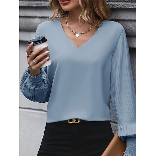 Per donna Blusa Tinta unica Quotidiano Elegante Casual Manica Lunga Scollo a V Top Regolari Quotidiano Arricciato Blu Rosa Cachi Primavera Autunno