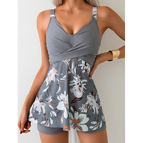 Costume da bagno tankini 2 pezzi donna gamba a boy controllo pancia vita alta snellente senza schiena vacanza spiaggia indossare floreale collo a V senza maniche