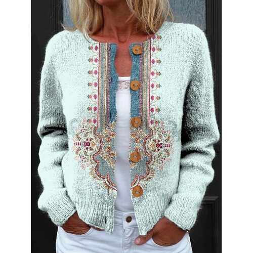 Maglione Cardigan da Donna In Maglia A Coste Con Bottoni Davanti Collo Rotondo Maniche Lunghe Leggero Casual Con Stampa Floreale Colori Rosso Verde Primavera Autunno