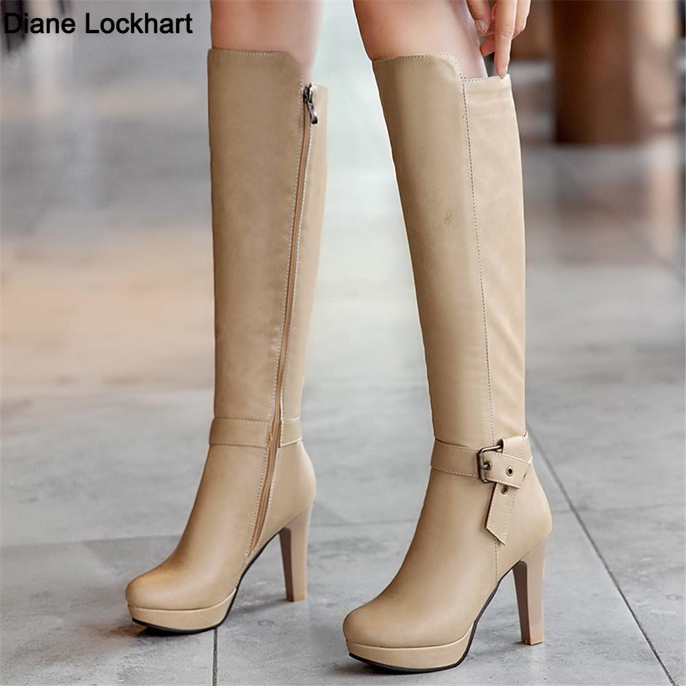 Knee High Heels Boots Platform Woman Autumn Winter Long Boots Mujer Ankle Strap Buckle Apricot Thin heels Zip Boots cm