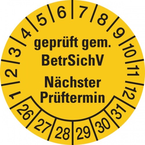 König Werbeanlagen Prüfplakette ab 26, BetrSichV Nächster Prüftermin, gelb/schwarz, Folie, Ø 30 mm - Bogen = 10 Plaketten - 30 mm Folie selbstklebend