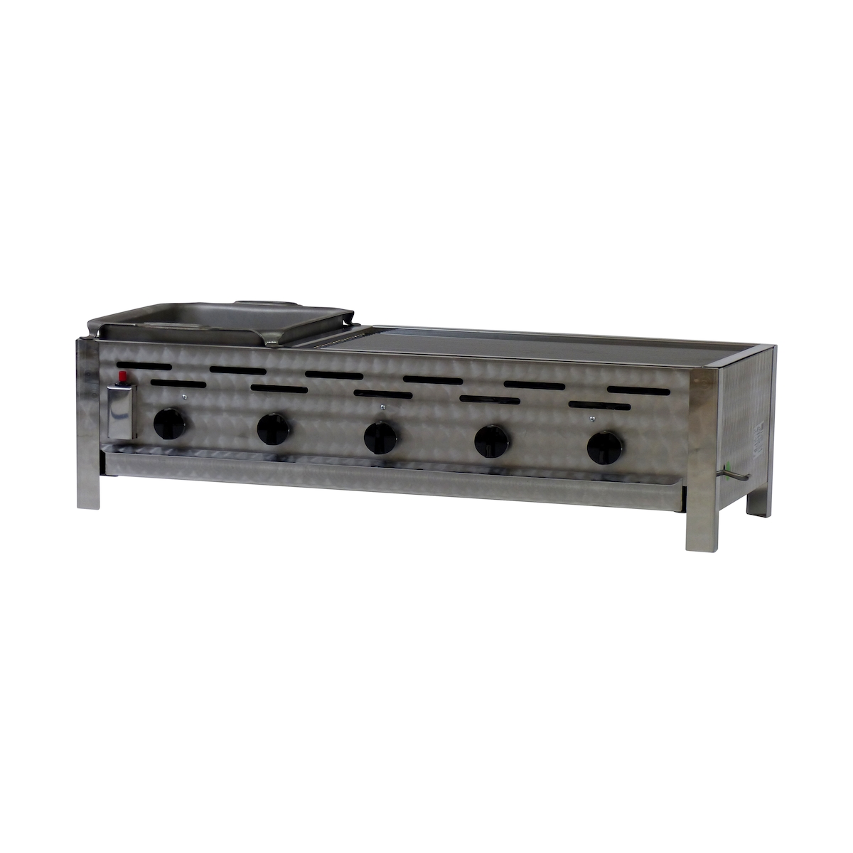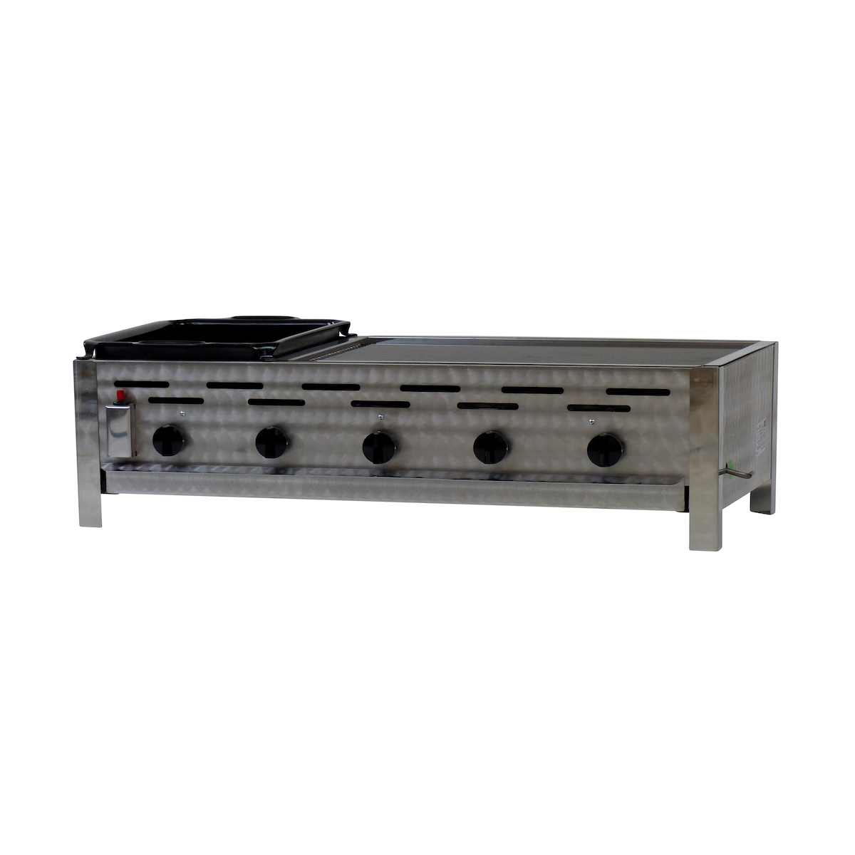 Gastrobräter, 5 Brenner je 4,5 kW, mit Grillrost und Edelstahlpfanne, B 980 x T 530 x H 270 mm, inkl. Gewerbedruckregler u. Schlauchbruchsicherung