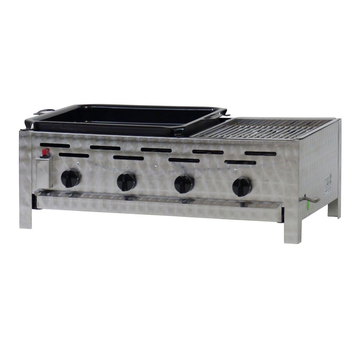 Gastrobräter, 4 Brenner je 3,6 kW, mit Grillrost u. emaill. Stahlpfanne, B 810 x T 530 x H 270 mm, inkl. Gewerbedruckregler u. Schlauchbruchsicherung