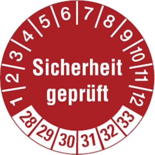 Dreifke® Aufkleber | Prüfetikett Sicherheit geprüft ab 28 rot/weiß - 30 mm Folie selbstklebend, 10 St