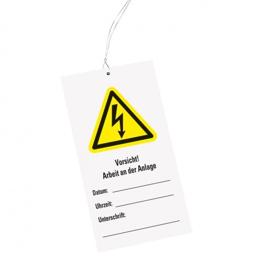 Wartungsanhänger Vorsicht! Arbeit a.Anlage, Kunststoff, 76x147mm, Kabelbinder, 10/VE, ASR A1.3, DIN EN ISO 7010 W012