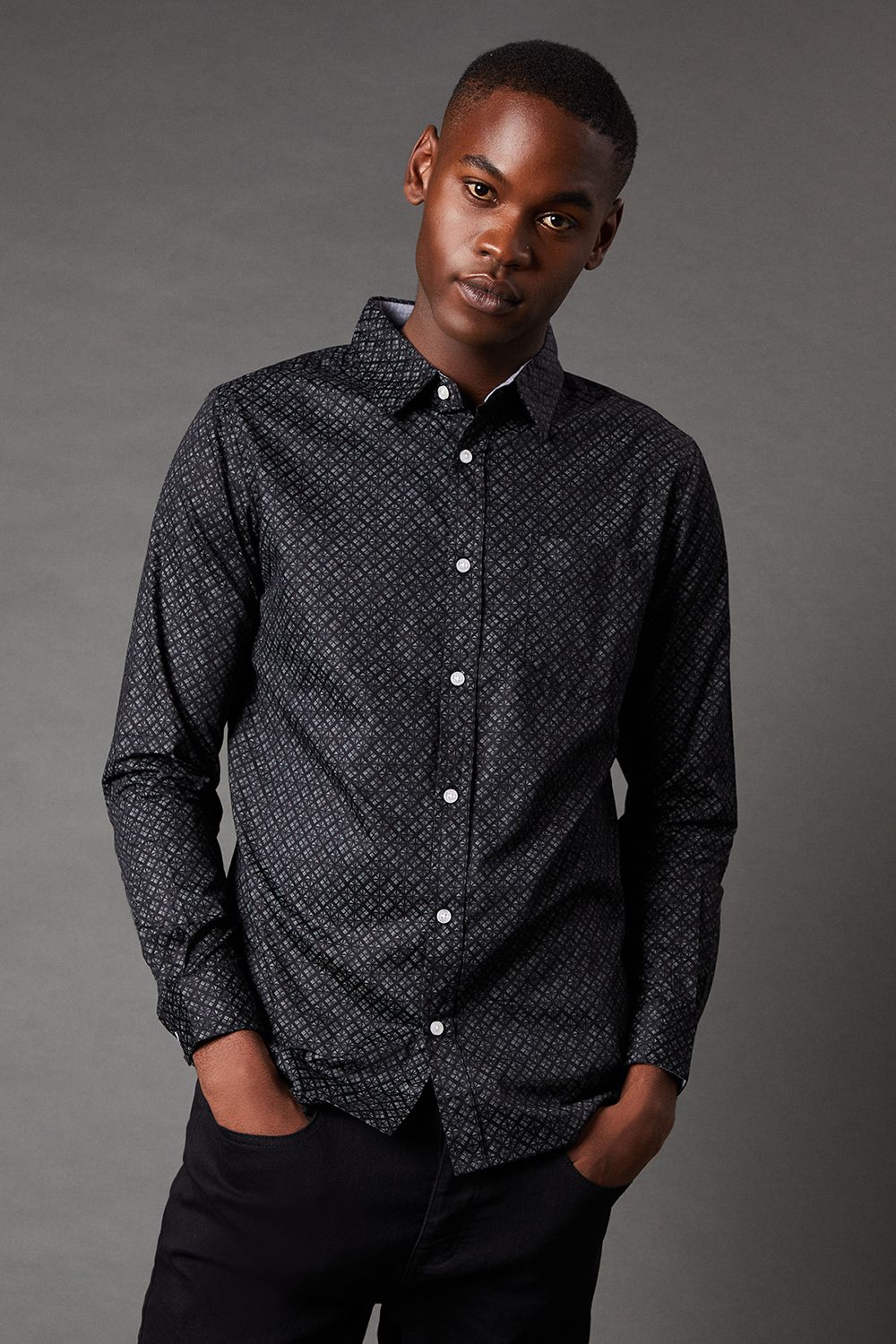 Maine Mens Geometric Print Long Sleeve Shirt - Black Cotton - Size Small | Maine Sale | Discount Designer Brands