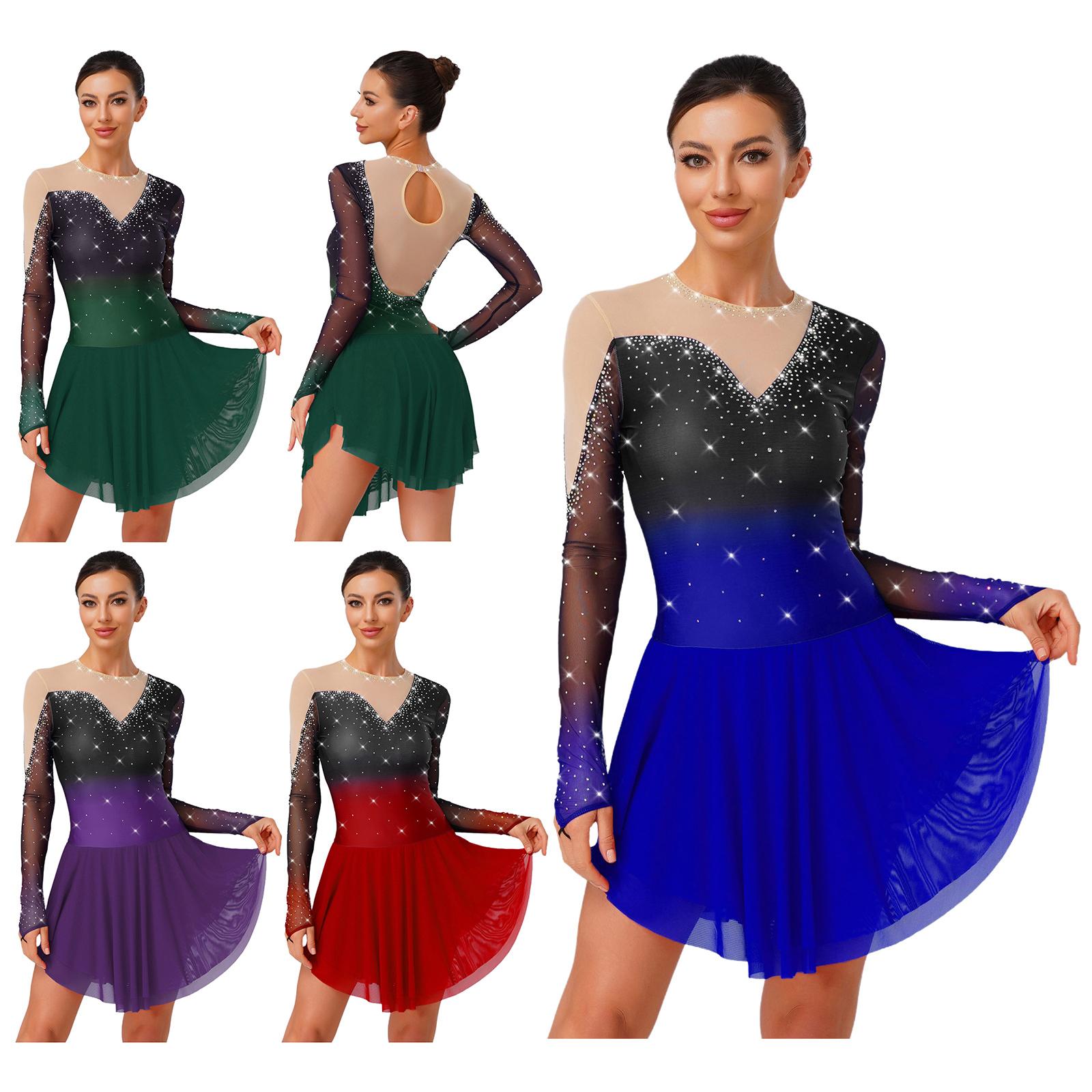 Kunstschaatsjurk Dames Schaatsjurk voor meisjes Strass Lange mouwen Mesh Training Wedstrijdschaatskleding cm koningsblauwe kleur