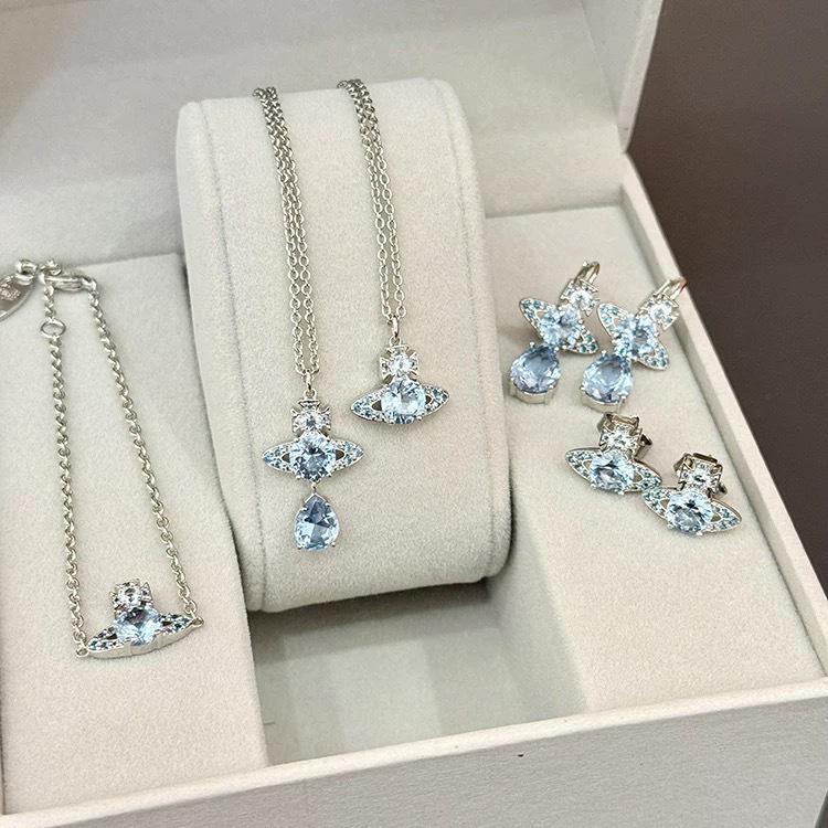 Vivienne Westwood Ice Blue Teardrop Saturn Necklace, Earrings, and Bracelet Set for Women