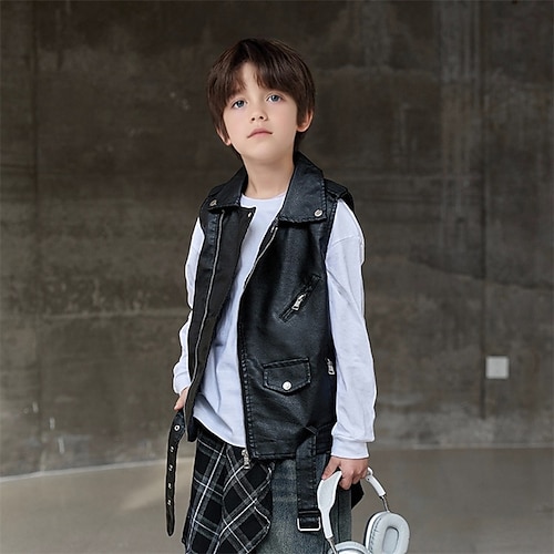 Bambini Ragazzi Giacca in pelle nera Gilet Giacca di pelle Capispalla Semplice Manica Lunga Con zip Impermeabile Antivento Cappotto Quotidiano Moda Casual Nero Primavera Autunno 4-12 Anni