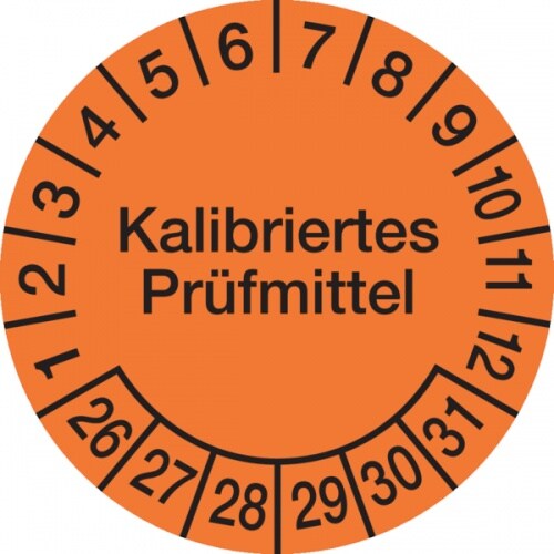 König Werbeanlagen Prüfplakette ab 26, Kalibriertes Prüfmittel, Orange/Schwarz, Folie, Ø 30´mm - Bogen = 10 Plaketten - 30 mm Folie selbstklebend