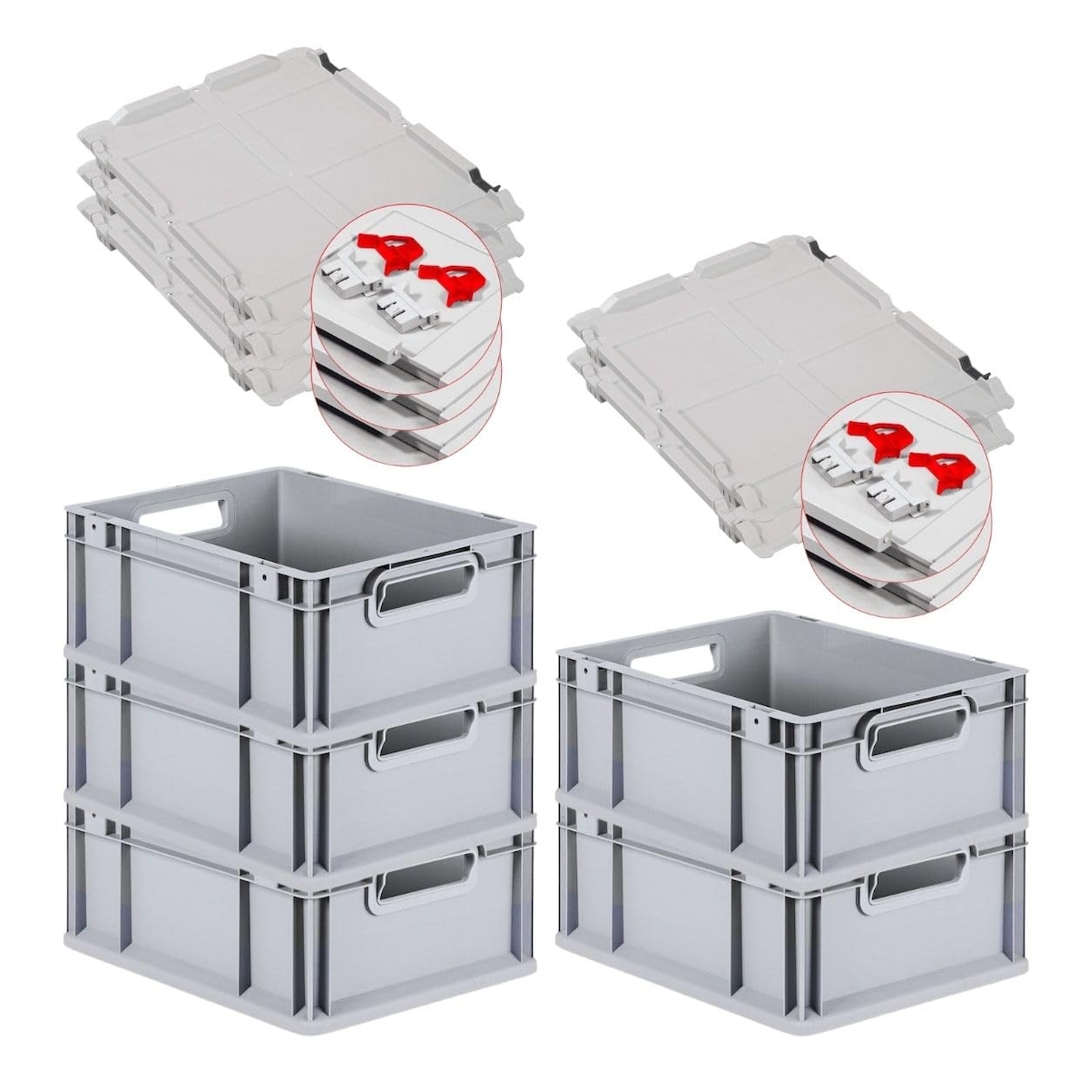 PROREGAL SuperSparSet 5x Eurobox NextGen Economy mit Scharnierdeckel & roten Verschlüssen, Griffe offen, HxBxT 17x30x40cm, 16L, Eurobehälter, Box