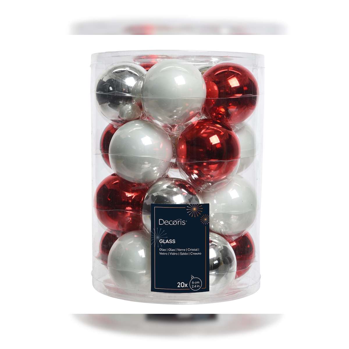 20 Weihnachtskugeln 6cm Glas Christbaumkugeln Set Weihnachtsbaum rot weiß silber