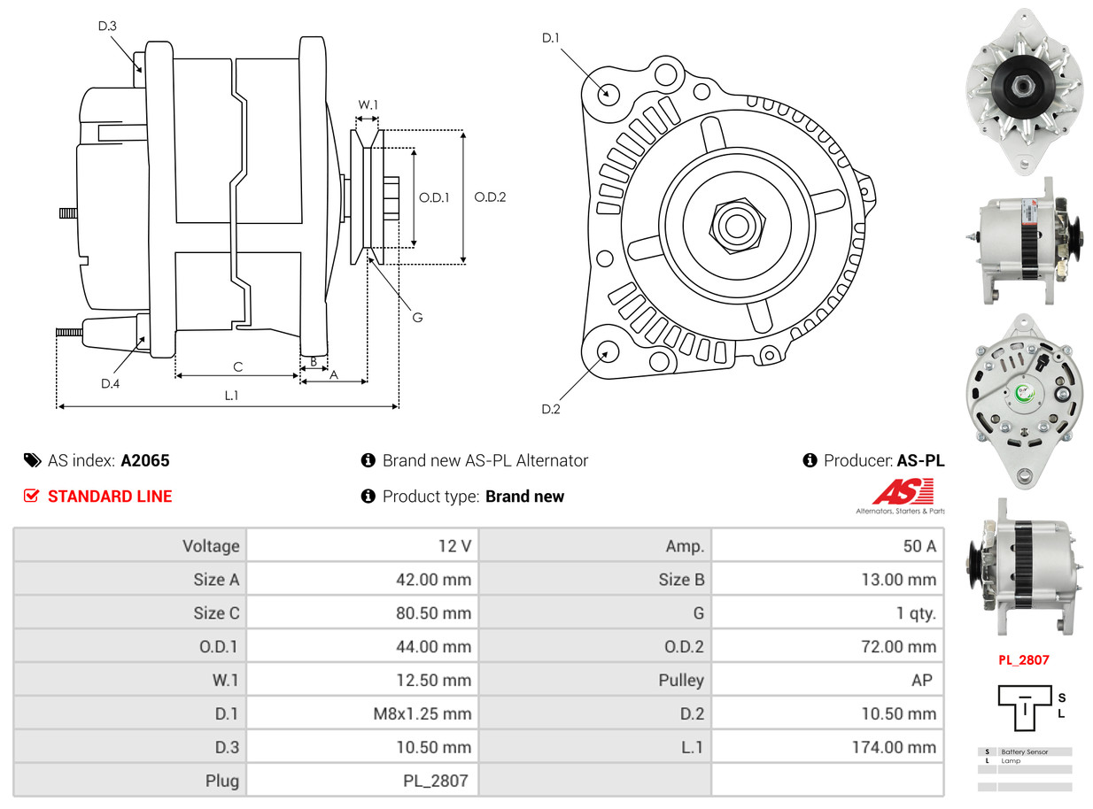 AS-PL Generator A2065 12V 50A für MITSUBISHI DAF MAZDA NISSAN 23100M6600 23100H7710 23100M6601