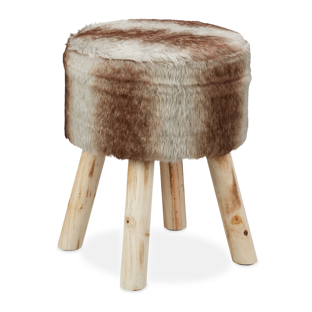 Relaxdays Fellhocker, Deko Hocker Kunstfell, Sitzhocker mit Holzbeinen, rund, rustikal, H x D: 42 x 33 cm, grau/braun