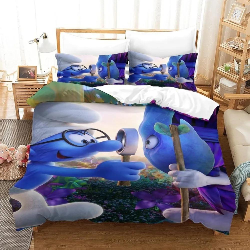 Cute Animated Pattern Print Smurfs Duvet Cover 3D Print Blue Elves Bedding Set For Teenagers Adult With Zip Room Decor