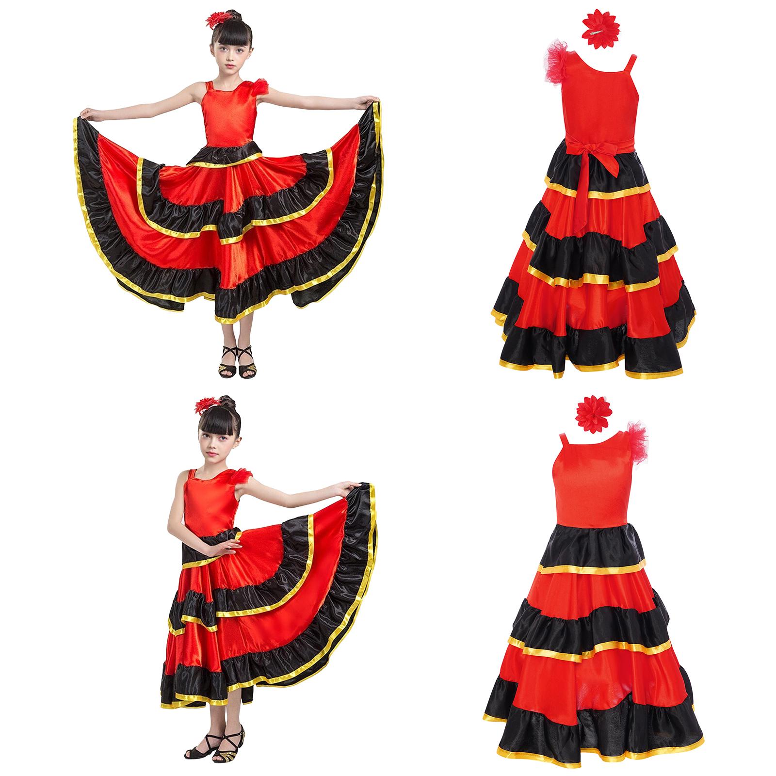 Mädchen Farbblock Tanzkleid Asymmetrische Schulter Stufenrüschen Weiter Saum Flamenco Kostüm Kopfbedeckung cm