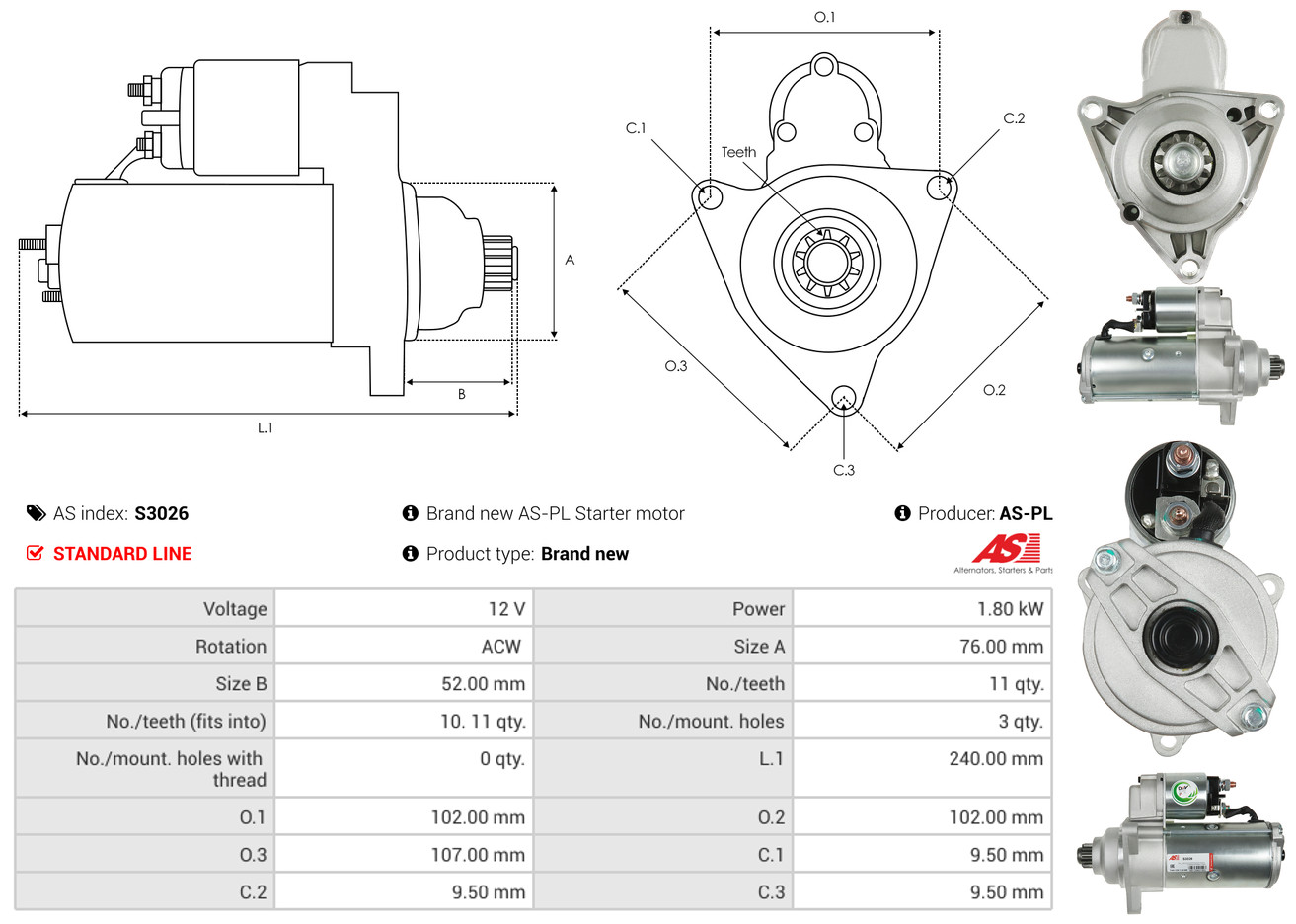 AS-PL Starter 12V für VW DAF MERCEDES-BENZ FORD 020911024AX R95VW-11000-CC 1029405 S0417