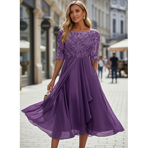 Per donna Abito Midi Abito in Pizzo Abito da Cocktail Abito da invitata a nozze Vestito in Chiffon Elegante Formale Feste Matrimonio Vestibilità regolare Mezza Manica Girocollo Rosa Vino Viola Oro