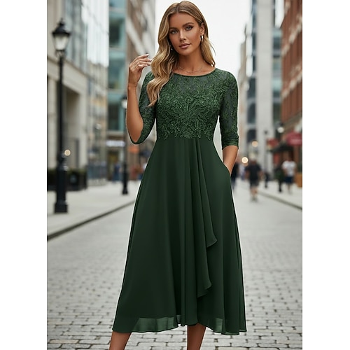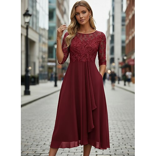 Per donna Abito Midi Abito in Pizzo Abito da Cocktail Abito da invitata a nozze Vestito in Chiffon Elegante Formale Feste Matrimonio Vestibilità regolare Mezza Manica Girocollo Blu Rosa Vino Verde