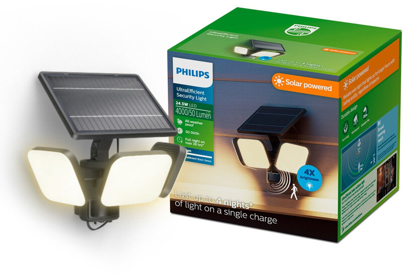 Philips UltraEfficient Zyren Wandlamp - Solar Beveiligingslamp - Bewegingssensor - Helder wit licht: 3000K - 24,5W - Zwart - Twee lichtstanden - Schemersensor - Zonne-energie - Waterbestendig