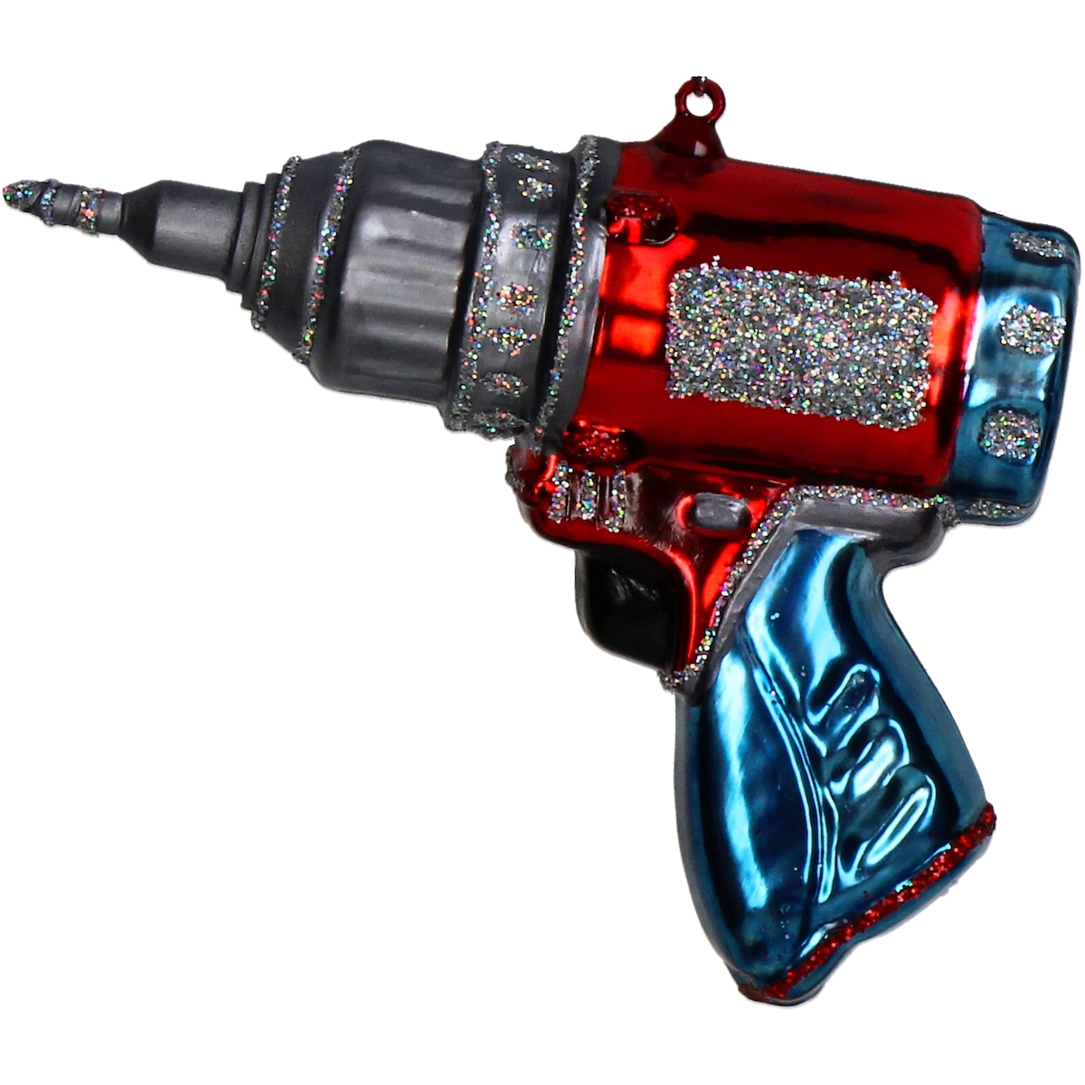 Christbaumschmuck Glas 12,7cm Bohrmaschine Figur Handbemalt & mit Glitzer Weihnachtsbaum Anhänger Weihnachten Weihnachtsbaumschmuck Werkzeug Rot Blau