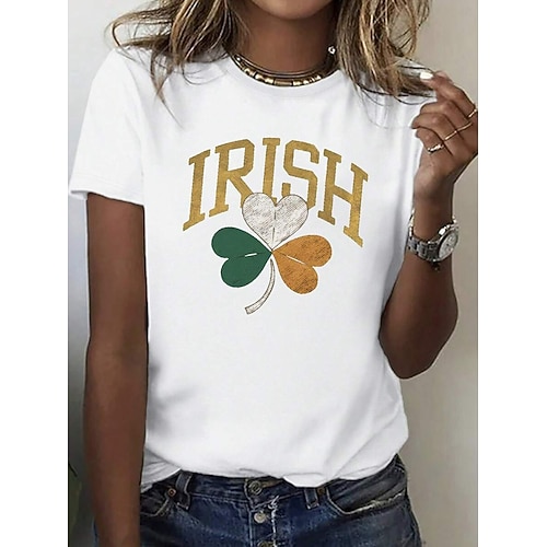 T-Shirt Donna per il Giorno di San Patrizio con Grafica Trefoil Lettera Vintage Stilosa Classica Manica Corta Collo Rotondo Top Regolari Stampa Giornaliera Nero Bianco Grigio Estate Primavera