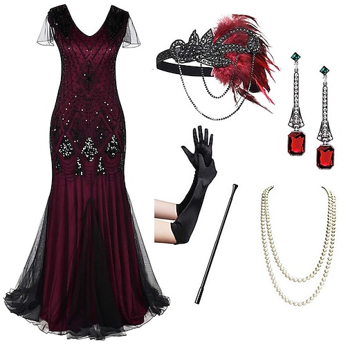 Retrò Vintage Anni Ruggenti Anni 1920 Lunghezza al pavimento Vestito Abiti Abito da cocktail Maniche corte Il grande Gatsby Invitato al matrimonio Paillettes Scollo a V Costume Per donna