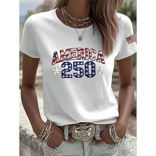 maglietta da donna americana 250° anniversario, grafica, bandiera americana, giorno dell'indipendenza, vintage, elegante, classica, manica corta, girocollo, scollo a V, girocollo, top normali, stampa