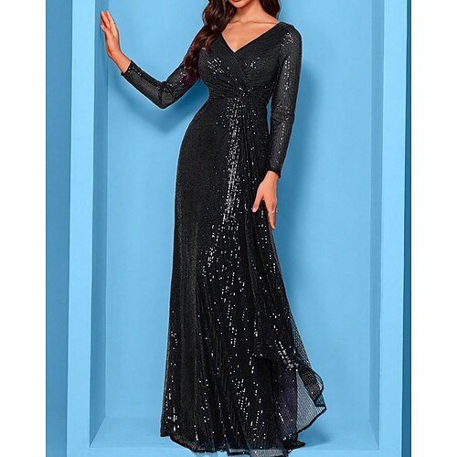 Abito da sera A-Line Black Tie abito elegante matrimonio formale lunghezza da terra manica lunga V Neck in paillettes con nodi arricciati