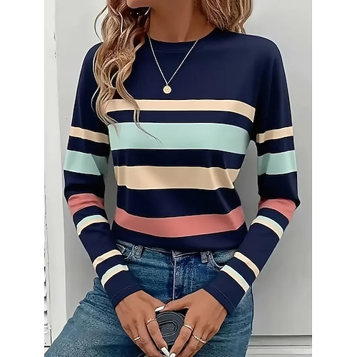 Per donna Maglietta Grafico A righe Vintage Moda Elegante Manica Lunga Girocollo Top Regolari Quotidiano Weekend Stampato Blu Bianco Cachi Autunno Inverno