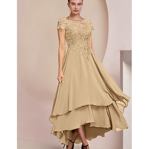 Linea ad A Asimmetrico Lunghezza Tè Vestito da Festa Abito da Cocktail Abito da invitata a nozze Abito da cerimonia per signora Manica Corta Scollo Tondo Elegante Alto Basso Formale Ospite di nozze