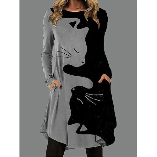 Per donna Abito Midi Tubino Vestito T-Shirt Abito a trapezio Abito sportivo Vacanza Casual Boho Quotidiano Vestibilità regolare Grafico Gatto Manica Lunga Girocollo Blu Grigio Estate Primavera Autunno