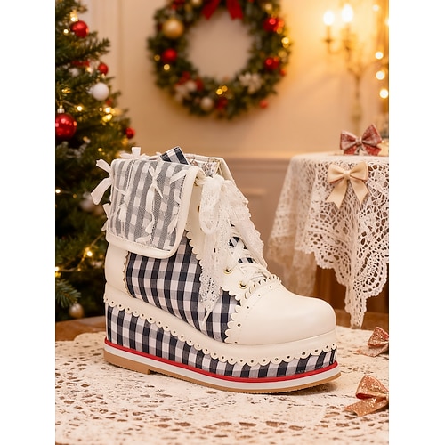 stivali da donna con plateau e lacci a quadretti rossi – adorabile stile retrò con dettagli in pizzo e motivo a quadri per Natale, Lolita e festività invernali
