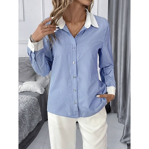Per donna Blusa A righe Vintage Casual Manica Lunga Colletto a Camicia Top Regolari Quotidiano Bottoni Stampato Blu Primavera Autunno