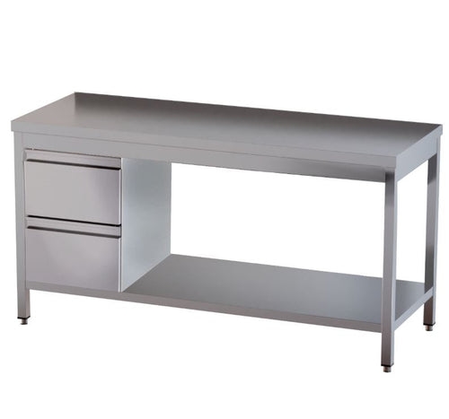 Edelstahl Arbeitstisch mit Grundboden, 2 Schubladen links, Premium - montiert: 140 x 70 cm / mit Aufkantung / fertig montiert